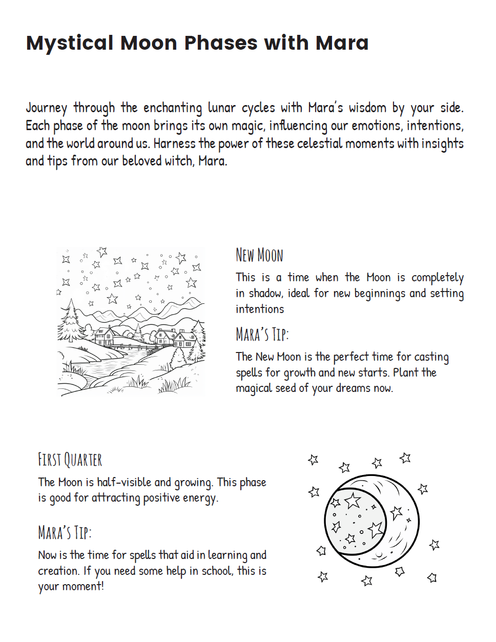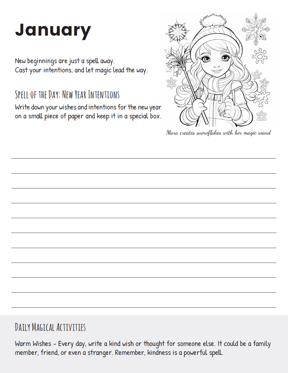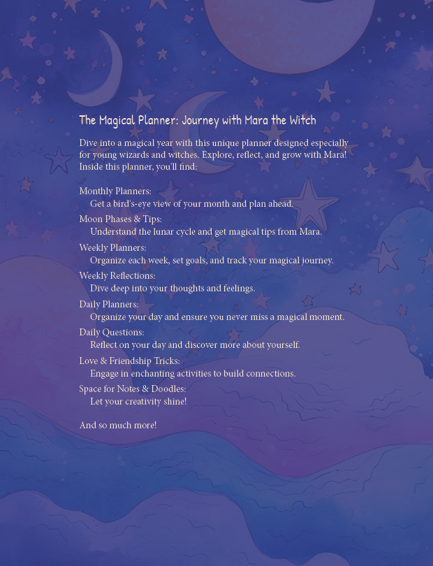 Crafted with love and sprinkled with enchantment, this planner is not your ordinary organizer. Each month invites you into a beautifully illustrated scene featuring Mara, sparking creativity as you color in her adventures. And with each page turned, a new spell or incantation beckons, offering both inspiration and a touch of magic to your day.